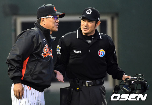 2회초 2사 2루 김문호가 몸에 볼을 맞았다는 주장에 심판이 인정해주지 않자 롯데 김시진 감독이 심판과 이야기를 나누고 있다.