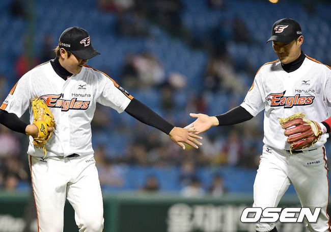 3회초 두산 공격 2사 2루 상황 한화 3루수 송광민이 최영진의 땅볼 타구를 더듬다 다시 잡아내 1루로 송구해 타자 주자를 아웃시켰다. 더그아웃으로 들어오며 인사를 나누는 한화 선발 유창식(왼쪽)과 송광민.