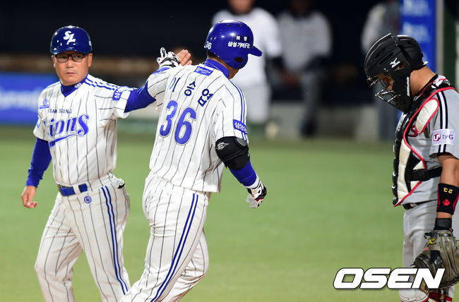 4회말 무사에서 삼성 이승엽이 우월 솔로 홈런을 날리고 홈에서 김평호 코치와 하이파이브를 하고 있다.