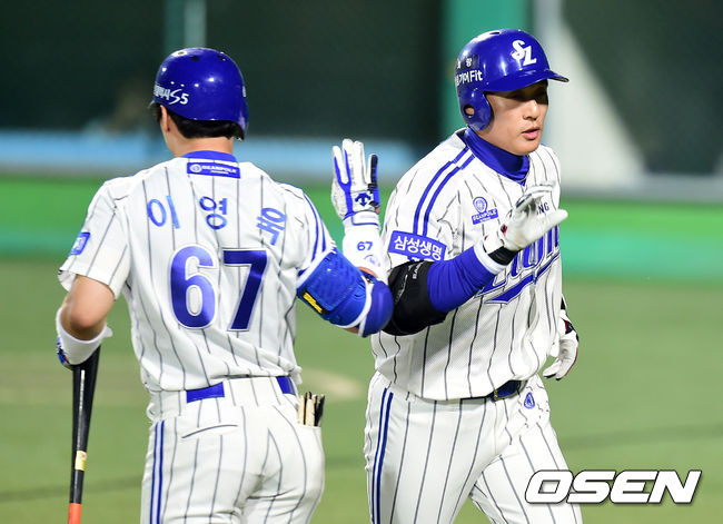 4회말 무사에서 삼성 이승엽이 우월 솔로 홈런을 날리고 이영욱과 하이파이브를 하고 있다.