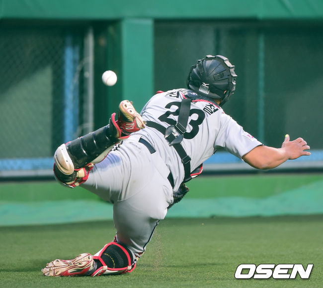 1회말 1사 1루에서 LG 최경철이 삼성 박석민의 파울 타구를 놓치고 있다.