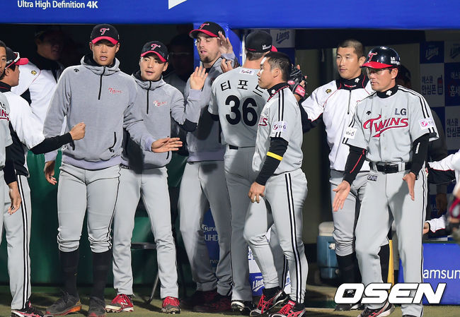 4회말 2사 만루에서 삼성 채태인을 삼진으로 처리한 LG 티포드가 더그아웃으로 가며 동료들과 하이파이브를 하고 있다.