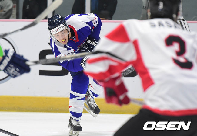 24일 오후 고양시 어울림누리 아이스링크에서 열린 '2014 고양 세계아이스하키 세계선수권대회' 디비전1 그룹A 한국과 일본의 경기 1피리어드 김우영이 슛을 시도하고 있다.