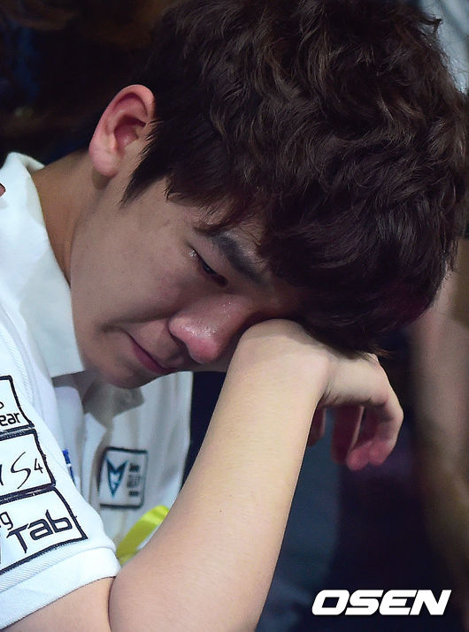 1세트 승리를 거둔 삼성 블루 '스피릿' 이다윤이 눈물을 흘리고 있다.