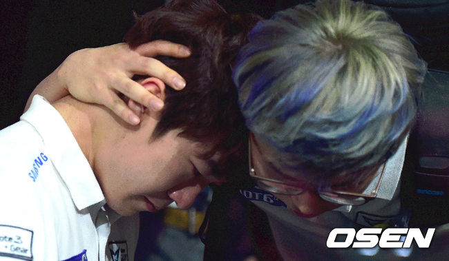 1세트 승리를 거둔 삼성 블루 '하트' 이관형이 승리의 안도감에 눈물을 흘리는 '스피릿' 이다윤과 이야기를 나누고 있다.