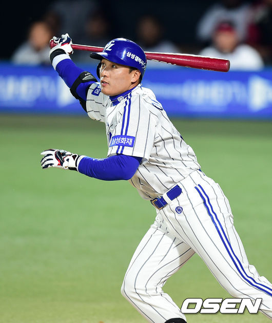 5회말 2사에서 삼성 이승엽이 좌익수를 향하는 큰 타구를 날리고 있다. 좌익수플라이.