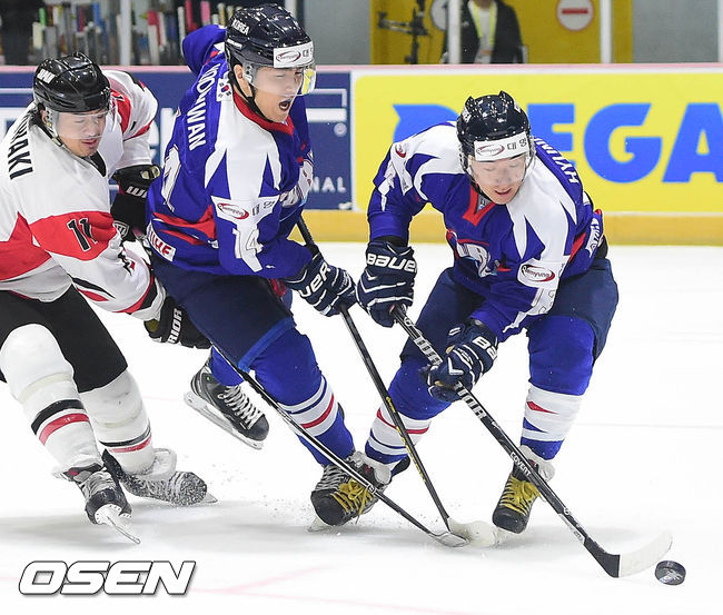 24일 오후 고양시 어울림누리 아이스링크에서 열린 '2014 고양 세계아이스하키 세계선수권대회' 디비전1 그룹A 한국과 일본의 경기 1피리어드 김윤환과 김형준이 일본 수비들과 퍽 다툼을 하고 있다.