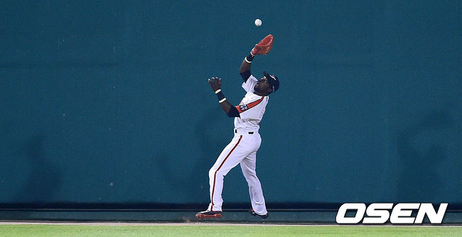 6회초 두산 공격 2사 3루 상황 양의지의 중견수 깊은 플라이 타구를 한화 중견수 피에가 잡아내고 있다.