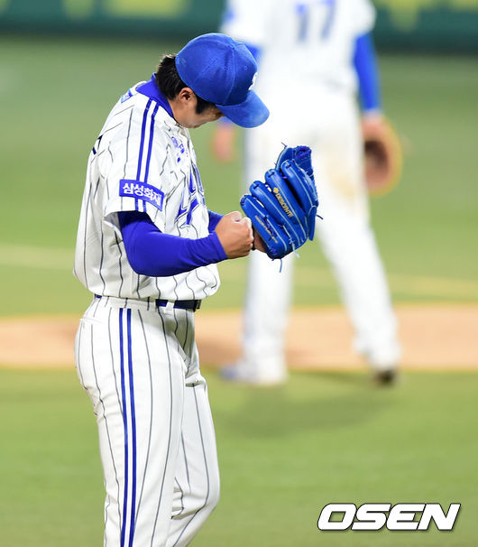 6회초 2사 1루에서 LG 조쉬벨에게 우월 투런 홈런을 허용한 삼성 배영수가 아쉬워하고 있다.