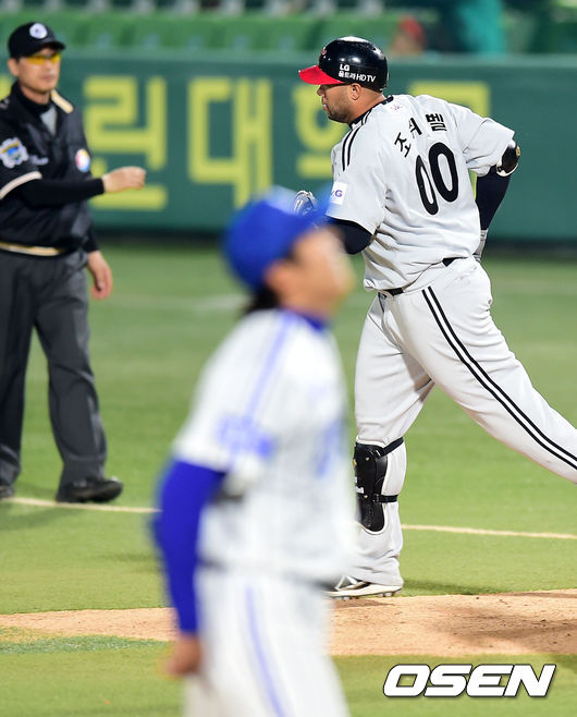 6회초 2사 1루에서 LG 조쉬벨이 우월 투런 홈런을 치고 그라운드를 돌고 있다.