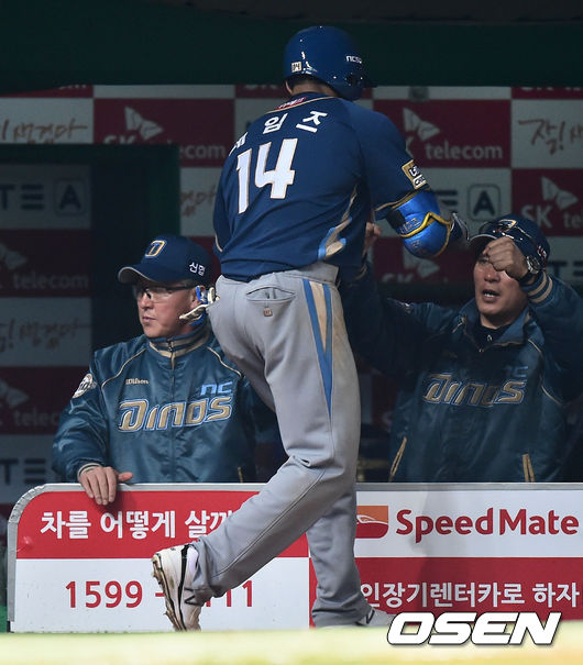 24일 오후 인천 문학구장에서 열린 2014 한국야쿠르트 세븐 프로야구 SK 와이번스와 NC 다이노스의 경기,5회초 1사 2루 NC 테임즈가 2점 홈런을 날리고 김경문 감독과 하이파이브를 하고 있다. NC가 7-5 리드.