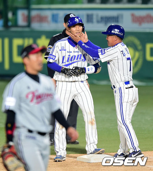 7회말 1사 만루에서 삼성 이흥련이 우전 적시타를 치고 김평호 코치와 환호하고 있다.