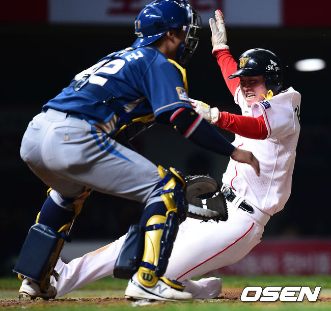 24일 오후 인천 문학구장에서 열린 2014 한국야쿠르트 세븐 프로야구 SK 와이번스와 NC 다이노스의 경기,6회말 2사 1루 SK 김강민의 1타점 적시타때 1루 루자 김성현이 홈에서 세이프되고 있다.