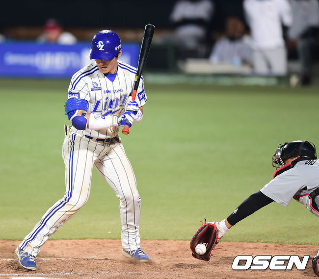 7회말 1사 만루에서 삼성 이영욱이 몸에 맞는 볼을 얻어내고 있다.