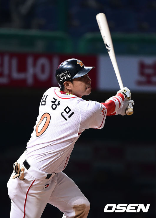 24일 오후 인천 문학구장에서 열린 2014 한국야쿠르트 세븐 프로야구 SK 와이번스와 NC 다이노스의 경기,6회말 2사 1루 SK 김강민이 1타점 적시타를 날리고 있다.