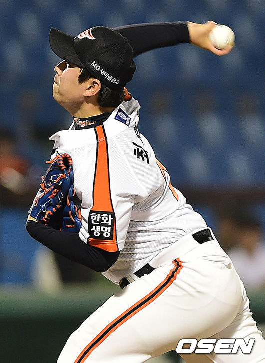 9회초 두산 공격 때 마운드에 오른 한화 투수 최영환이 힘차게 공을 뿌리고 있다.