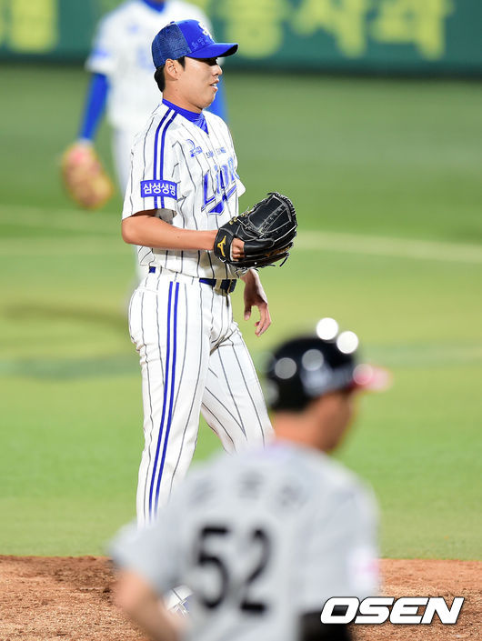 8회초 1사 만루에서 삼성 차우찬이 밀어내기 볼넷으로 실점을 허용하고 있다.