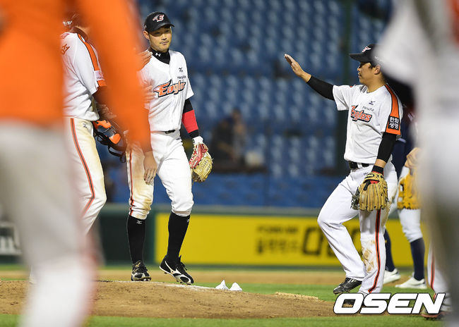 경기 종료 직후 한화 송광민을 비롯한 선수들이 마운드에서 하이파이브를 나누고 있다./dreamer@osen.co.kr