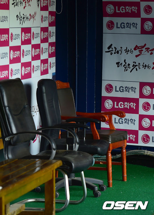 25일 오후 서울 잠실야구장에서 열리는 '2014 한국야쿠르트 세븐 프로야구' LG 트윈스와 KIA 타이거즈의 경기에 앞서 LG 더그아웃에 자진 사퇴한 김기태 감독의 전용 의자가 사라졌다.