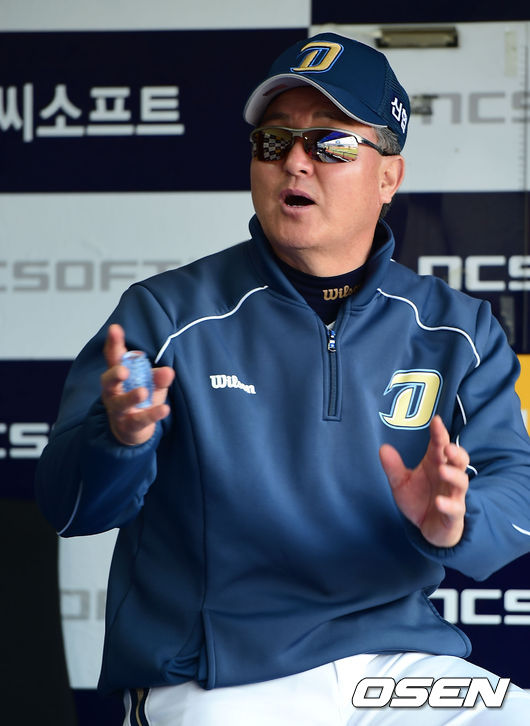경기에 앞서 NC 김경문 감독이 취재진과 이야기를 나누고 있다.