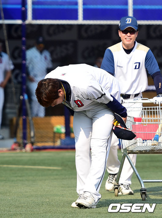 경기에 앞서 두산 김현수가 NC 김경문 감독을 향해 인사를 하고 있다.