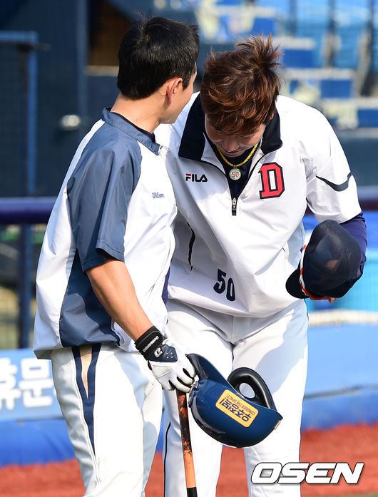 경기에 앞서 NC 손시헌이 두산 김현수와 인사를 나누고 있다.