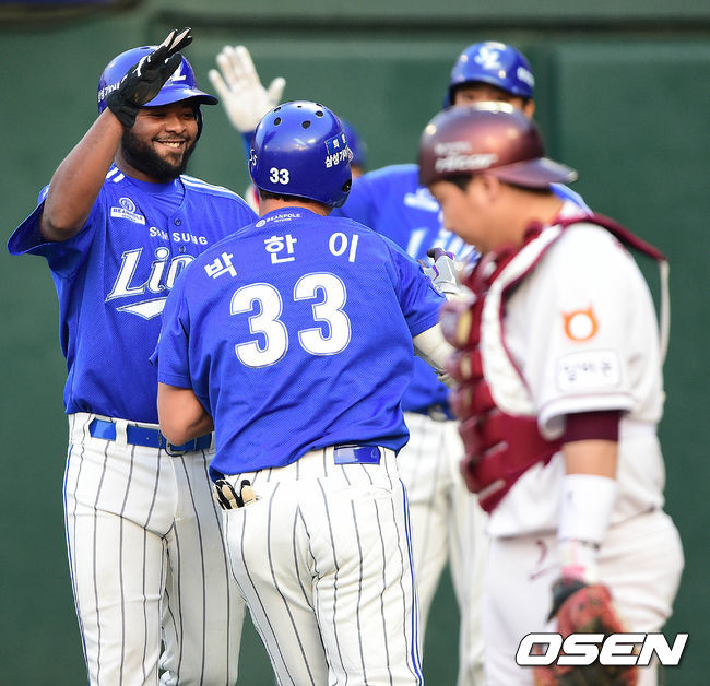 1회초 삼성 공격 무사 2루 상황 박한이가 선제 중월 투런포를 날리고 홈을 밟은 뒤 나바로를 비롯한 동료들과 인사를 나누고 있다.