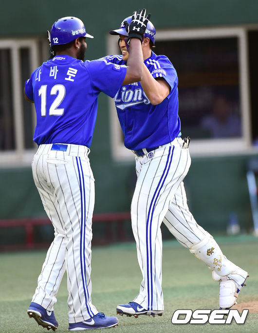1회초 무사 2루 삼성 박한이의 중견수 뒤 투런포로 홈을 밟은 나바로가 박한이와 하이파이브를 나누고 있다.