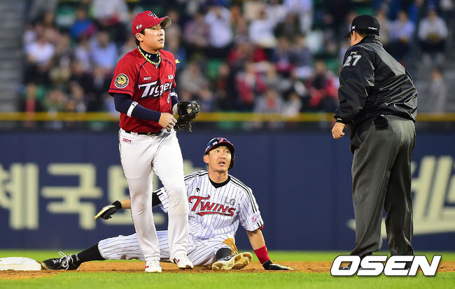 3회말 2사 LG 손주인이 좌전 안타를 때린 뒤 2루까지 진루하다 KIA 좌익수 김원섭의 송구에 아웃당하고 있다.