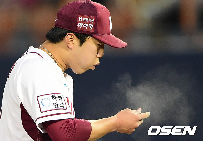 2회초 삼성 공격 2사 2루 상황까지 9실점한 넥센 투수 윤성환이 로진을 불고 있다.