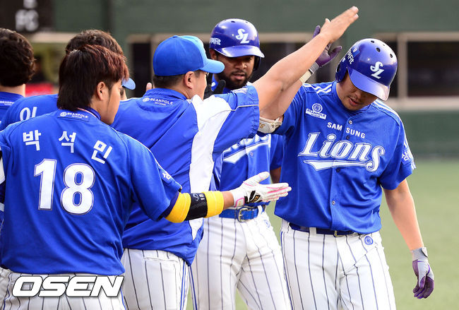 1회초 무사 2루 삼성 박한이의 중견수 뒤 투런포로 홈을 밟은 나바로와 박한이가 덕아웃에서 동료들로 부터 환호를 받고 있다.