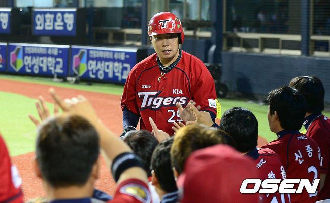 4회초 2사 1,2루 KIA 나지완이 김원섭이 적시타로 득점을 올린 뒤 동료들과 기뻐하고 있다.