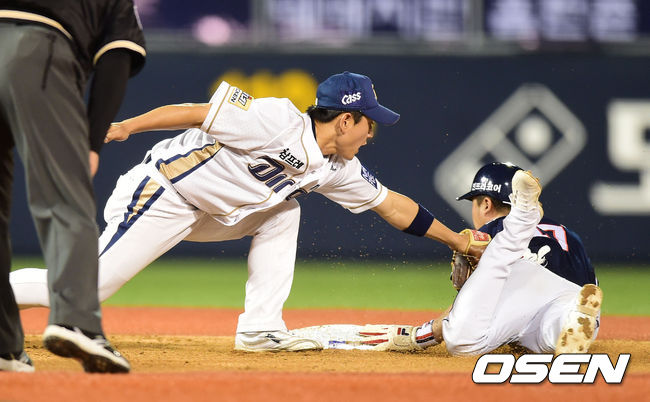 4회초 무사 1루에서 두산 김재호 타석 때 1루주자 오재원이 도루에 성공하고 있다.
