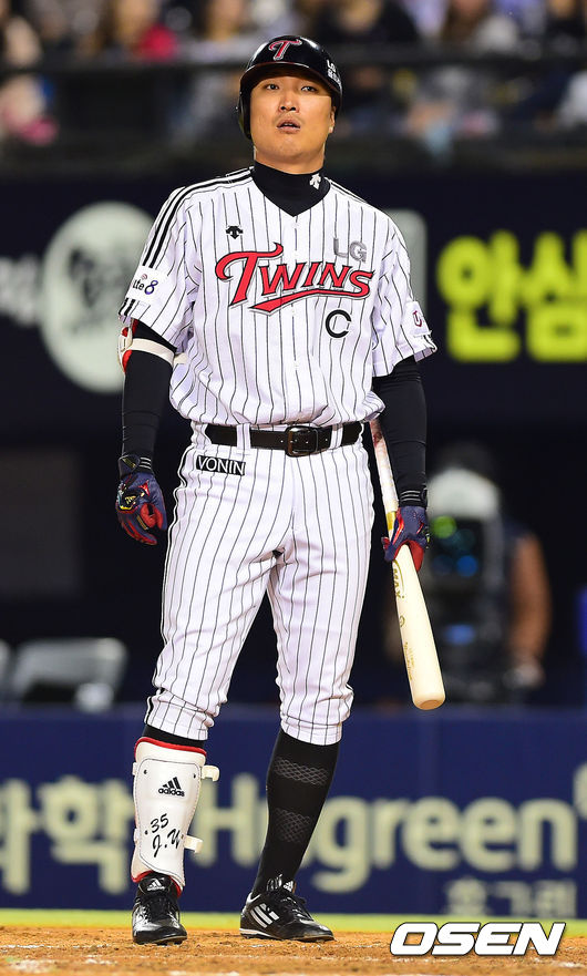 5회말 선두 타자로 나선 LG 이진영이 삼진을 당한 뒤 허탈한 표정을 짓고 있다.