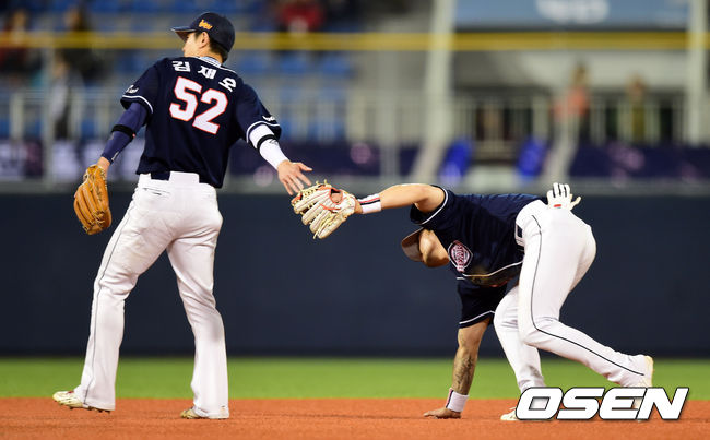 4회말 무사 1루에서 두산 오재원이 환상적인 수비로 NC 테임즈를 병살타로 처리하며 김재호와 하이파이브를 하고 있다.