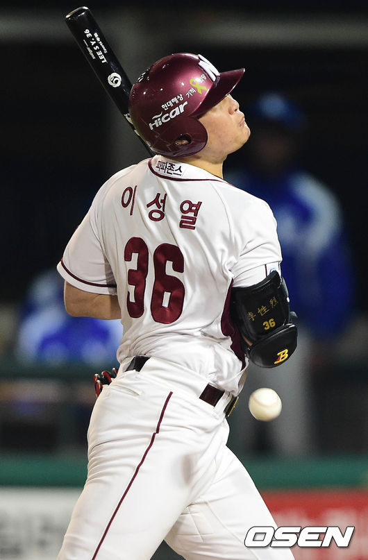 6회말 넥센 공격 1사 1, 2루 상황 이성열이 삼성 선발 윤성환의 투구에 몸을 맞으며 괴로워하고 있다.