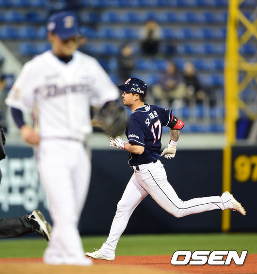 6회초 무사에서 두산 오재원이 중월 솔로 홈런을 치고 그라운드를 돌고 있다.