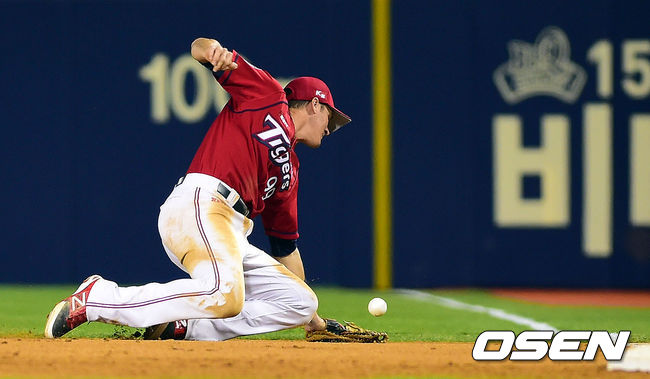 7회말 2사 1,2루 KIA 필이 오지환의 타구를 놓치고 있다.
