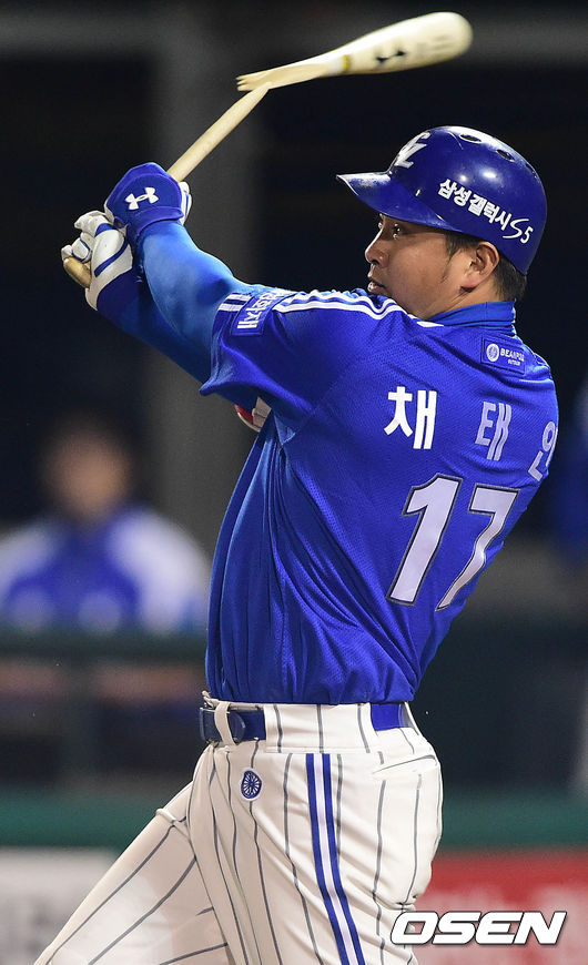 8회초 삼성 공격 1사 주자없는 상황 채태인이 좌전안타를 날릴 때 배트가 부러지고 있다.