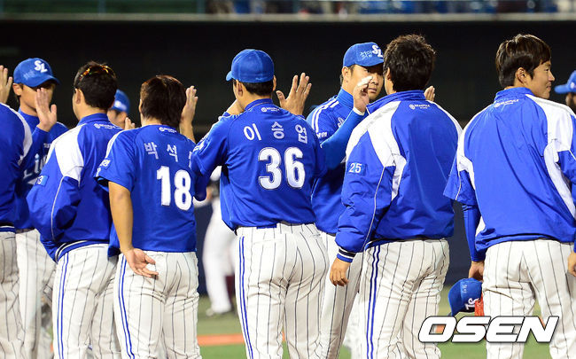 경기종료, 승리한 삼성 선수들이 기쁨의 하이파이브를 나누고 있다. /ouxou@osen.co.kr