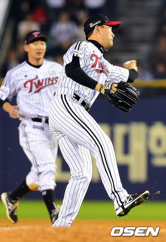 9회초 2사 1,2루 LG 봉중근이 KIA 필의 타구를 잡아 1루로 송구하고 있다./youngrae@osen.co.kr