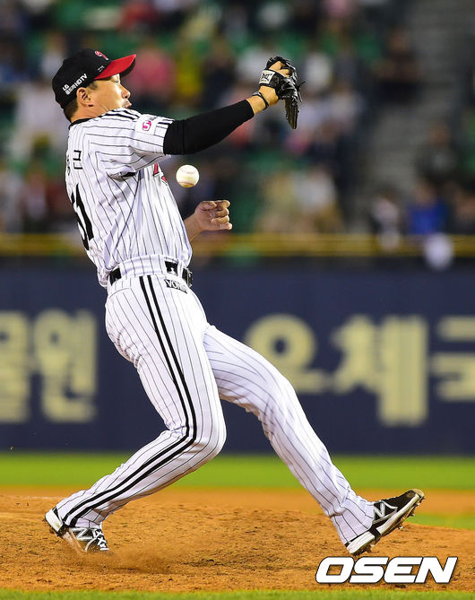 9회초 2사 1,2루 LG 봉중근이 KIA 필의 타구를 잡았다 놓치고 있다./youngrae@osen.co.kr