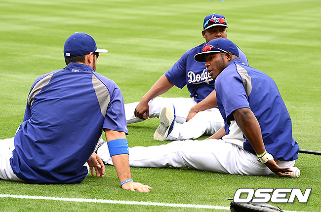 경기에 앞서 다저그 푸이그가 몸을 풀며 곤잘레스, 유리베와 이야기를 나누고 있다. 이날 미국의 연예정보 전문 매체 ‘HOLLYWOODREPORT'는 미국의 한 영화 제작사가 푸이그 스토리를 영화로 만들기 위한 작업을 시작했다고 보도했다.