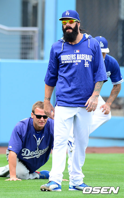 경기에 앞서 다저스 윌슨이 몸을 풀고 있다. 윌슨은 25일 경기서 9회초 동점상황에 마운드에 올라 4실점을 허용했다.