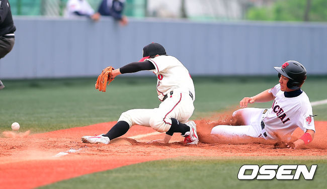 26일 오전 서울 신월야구장에서 열린 '2014 고교야구 주말리그' 덕수고와 배재고의 경기, 3회말 1사 2루 배재고 조주민이 덕수고 포수 김재성의 송구 실책으로 3루까지 진루하고 있다.