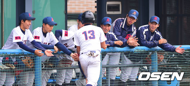 26일 오전 서울 신월야구장에서 열린 '2014 고교야구 주말리그' 덕수고와 배재고의 경기, 3회말 배재고 선수들이 득점을 올린 뒤 기뻐하고 있다.