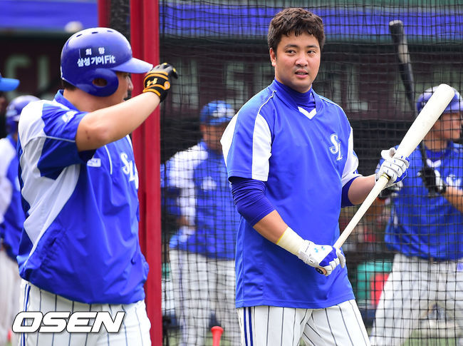 26일 오후 서울 목동구장에서 열리는 '2014 한국야쿠르트 세븐 프로야구' 넥센 히어로즈와 삼성 라이온즈의 경기에 앞서 삼성 채태인이 최형우와 이야기를 나누고 있다.
