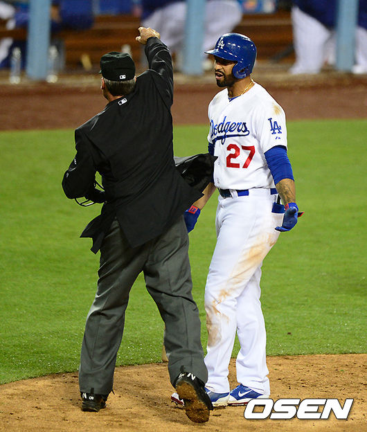 9회말 1사에서 다저스 맷 켐프가 삼진을 당하고 구심 판정에 불만을 나타내자 구심이 퇴장 명령을 내리고 있다. /jpnews@osen.co.kr