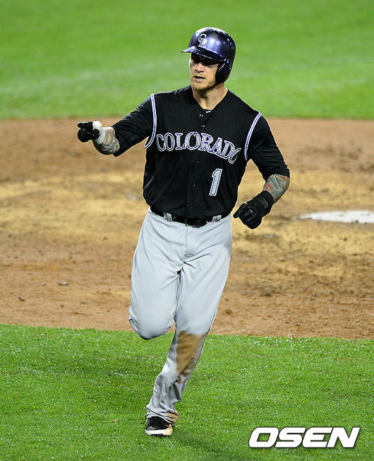 11회초 1사 2루에서 콜로라도 반스가 블랙몬의 1타점 중전 적시타에 홈을 밟고 기뻐하고 있다. /jpnews@osen.co.kr