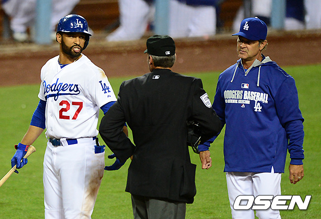 9회말 1사에서 다저스 맷 켐프가 삼진을 당하고 구심 판정에 불만을 나타내고 있다. 결국 맷 켐프는 퇴장을 당했다. /jpnews@osen.co.kr